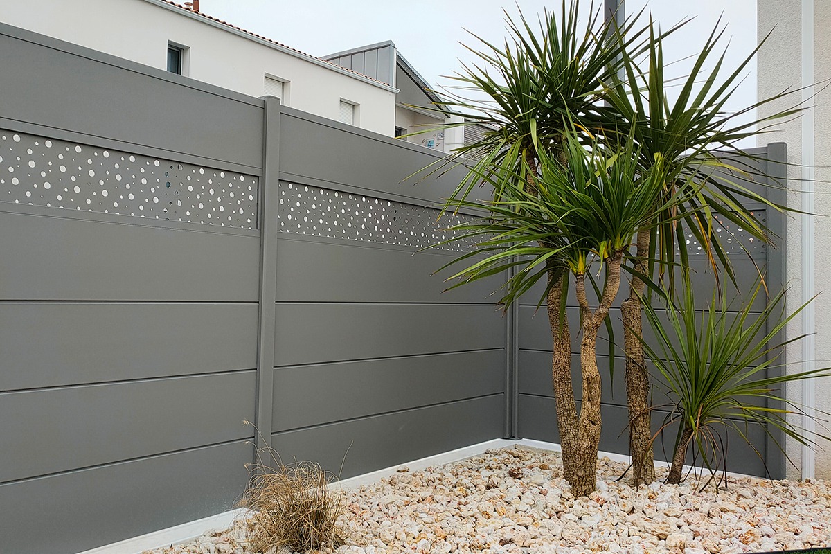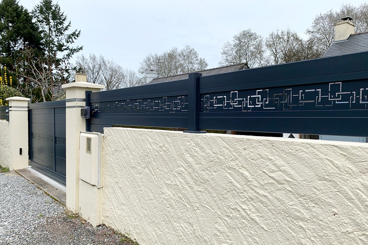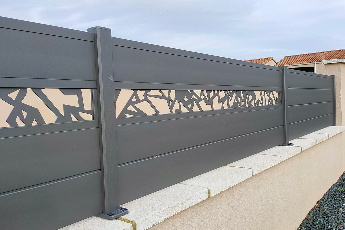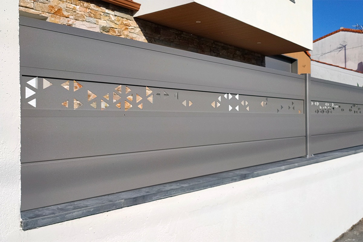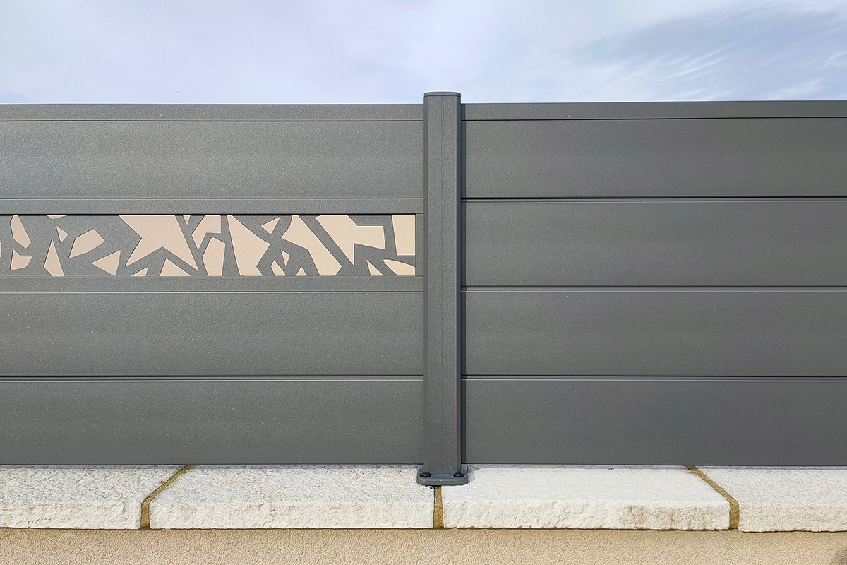 L’aluminium thermolaqué assure la longévité : pas de corrosion, tenue de teinte durable, entretien minimal. Les lames (255, 170, brise-vent 150, 85 mm) modulent l’épaisseur visuelle et le comportement au vent. La découpe laser ouvre un vaste choix de motifs, de la trame géométrique à l’inspiration végétale. L’intérêt majeur : la coordination avec les portails Signature (mêmes familles de décors) et les brise-vues Estampe. On obtient ainsi un fil conducteur graphique sur toute la propriété, avec un rendu premium et une cohérence immédiate.