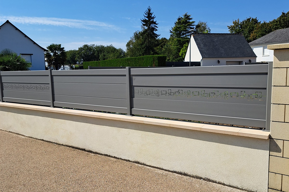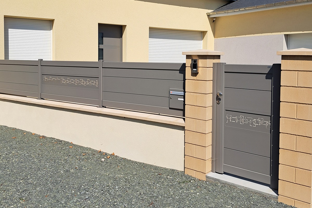 La base aluminium thermolaqué assure la durabilité (anti-corrosion) et l’entretien réduit. Les décors horizontaux reprennent l’esprit Estampe et se coordonnent naturellement avec les portails Signature décorés : un fil esthétique qui relie l’entrée, la clôture et, si souhaité, des brise-vues ponctuels.