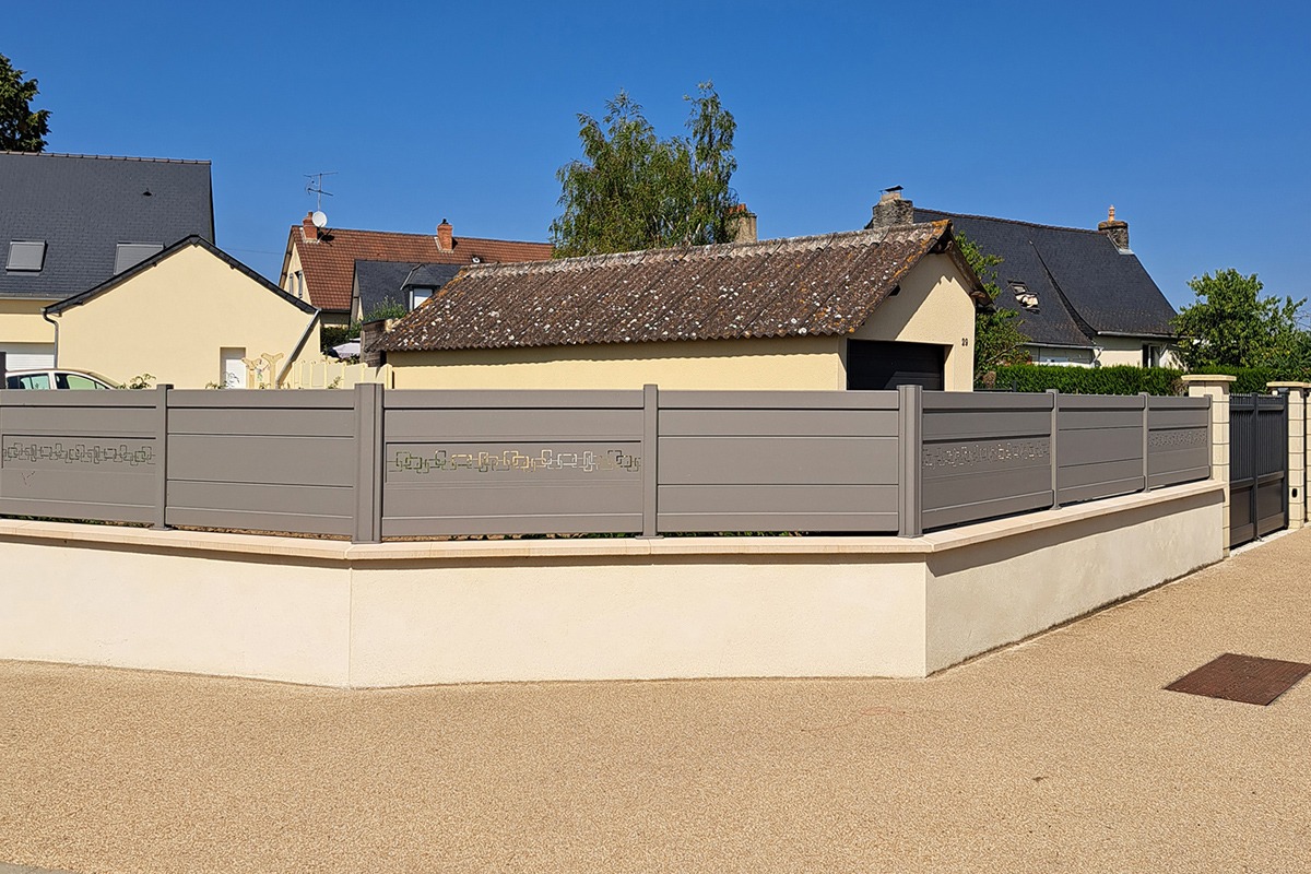 La clôture alu Nordica exploite la force des horizontales pour étirer la façade et créer une signature lisible de loin. Sur un panneau plein qui garantit l’intimité, des décors horizontaux viennent souligner la zone centrale ou la partie haute. Cet accent graphique transforme la clôture en véritable élément d’architecture : la bande décorative peut aligner visuellement des niveaux, dialoguer avec les appuis de fenêtres ou équilibrer des volumes dissymétriques.
