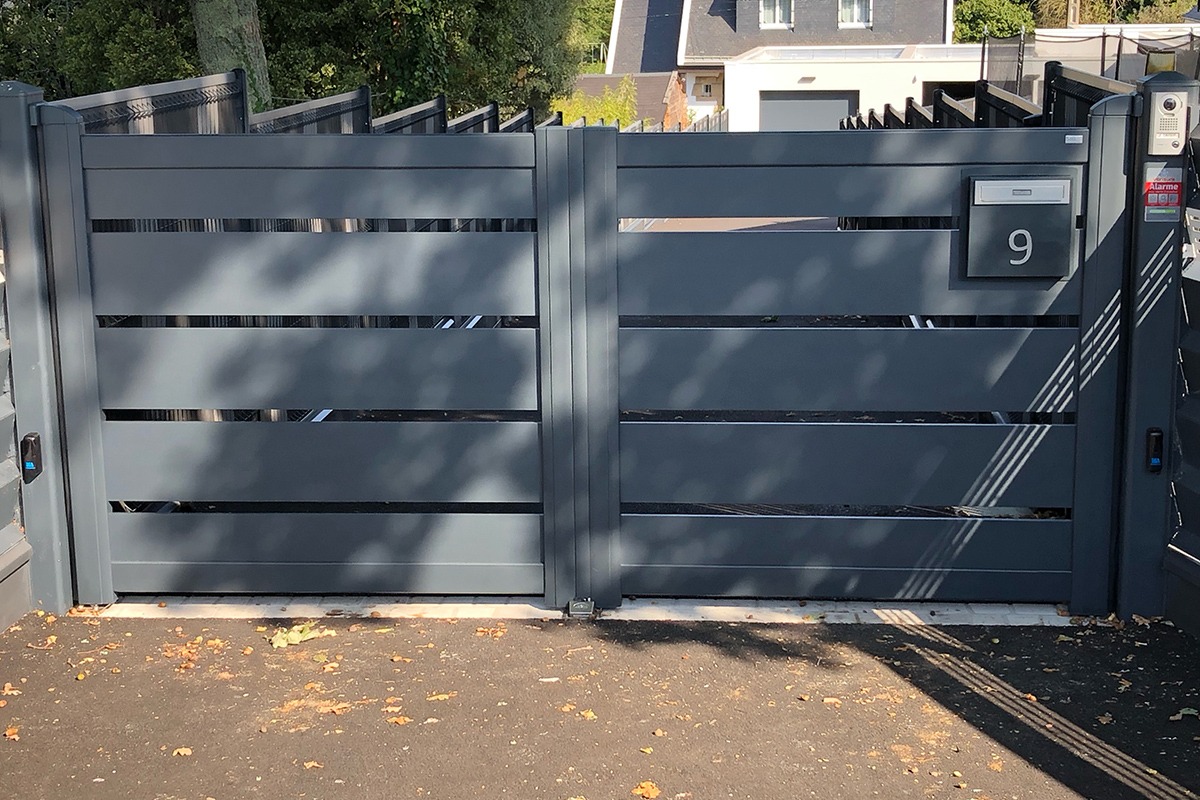 Le portail battant Tramontane est une solution élégante et fonctionnelle pour sécuriser l’entrée d’une propriété. Il est disponible avec des lames horizontales ajourées de 100 mm ou 250 mm, offrant une personnalisation visuelle selon le niveau de transparence souhaité. Ce modèle s’intègre harmonieusement dans des environnements contemporains et assure une ventilation naturelle sans compromettre la sécurité. Fabriqué en aluminium thermolaqué, il résiste aux intempéries, à la corrosion et aux déformations. Il peut s’ouvrir vers l’intérieur ou l’extérieur, selon les contraintes du terrain. Chaque vantail peut être motorisé ou laissé en ouverture manuelle.