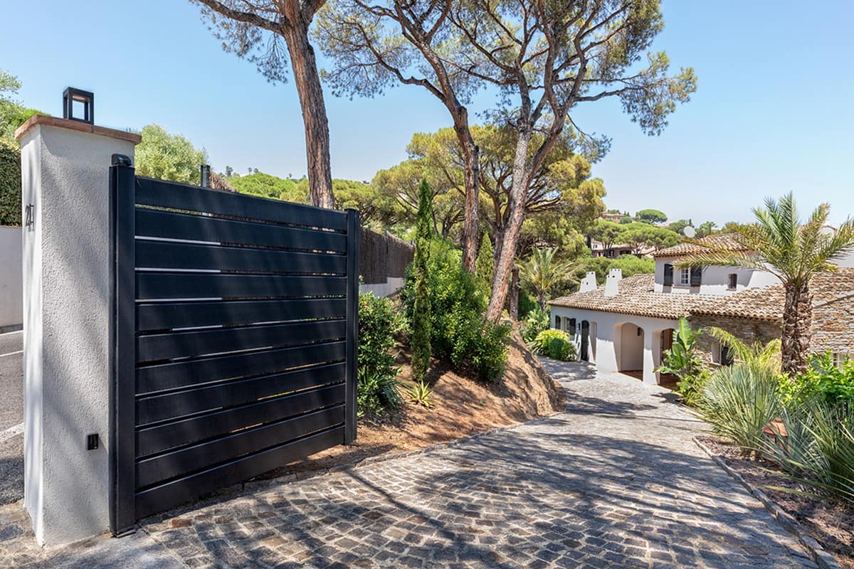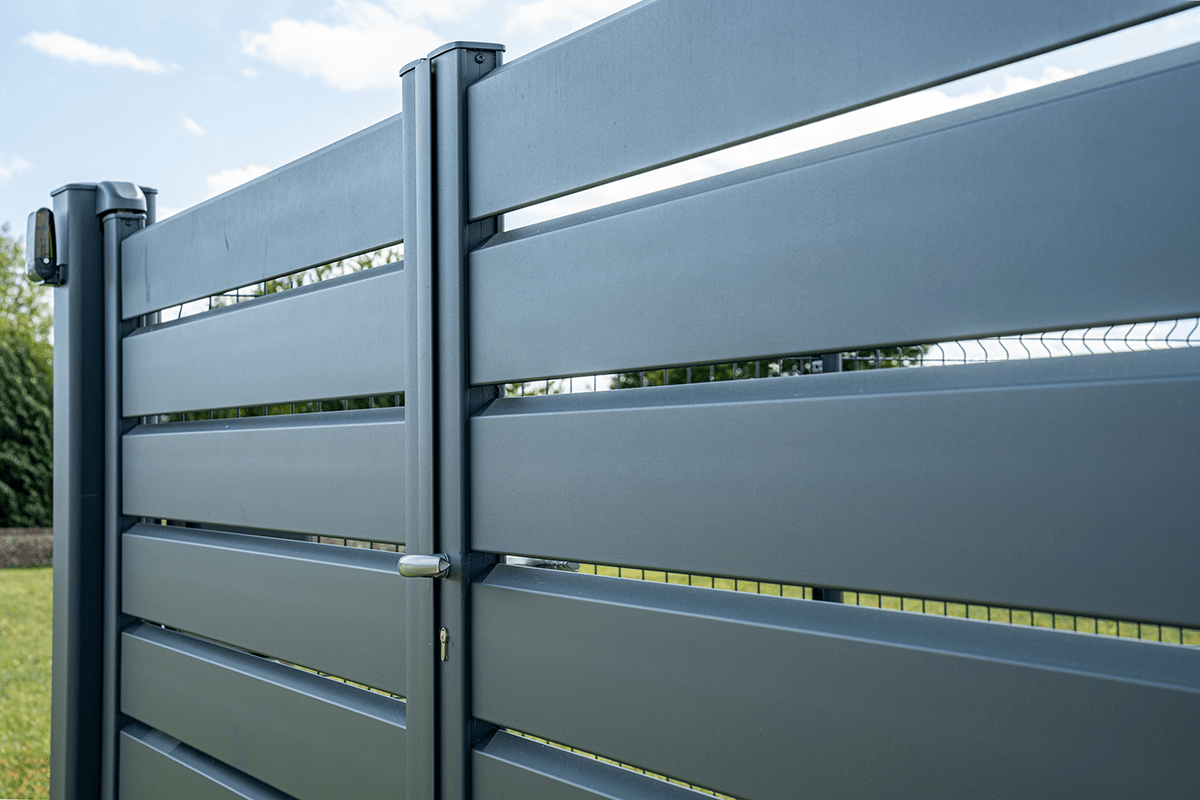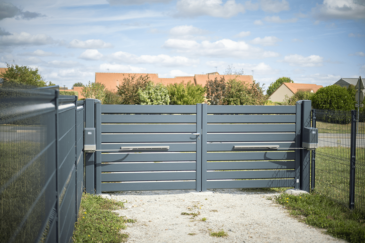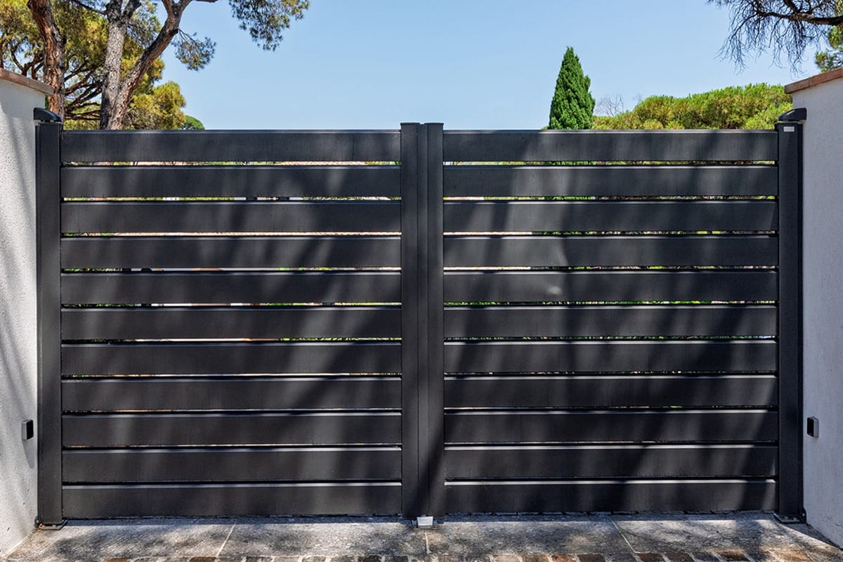 Pour ceux qui veulent alléger visuellement la façade et laisser passer l’air, le portail battant Andromède est le bon choix. Les lames ajourées dessinent un rythme horizontal chic et limitent la prise au vent — utile en bord de mer ou en zone exposée — tout en gardant de l’intimité.