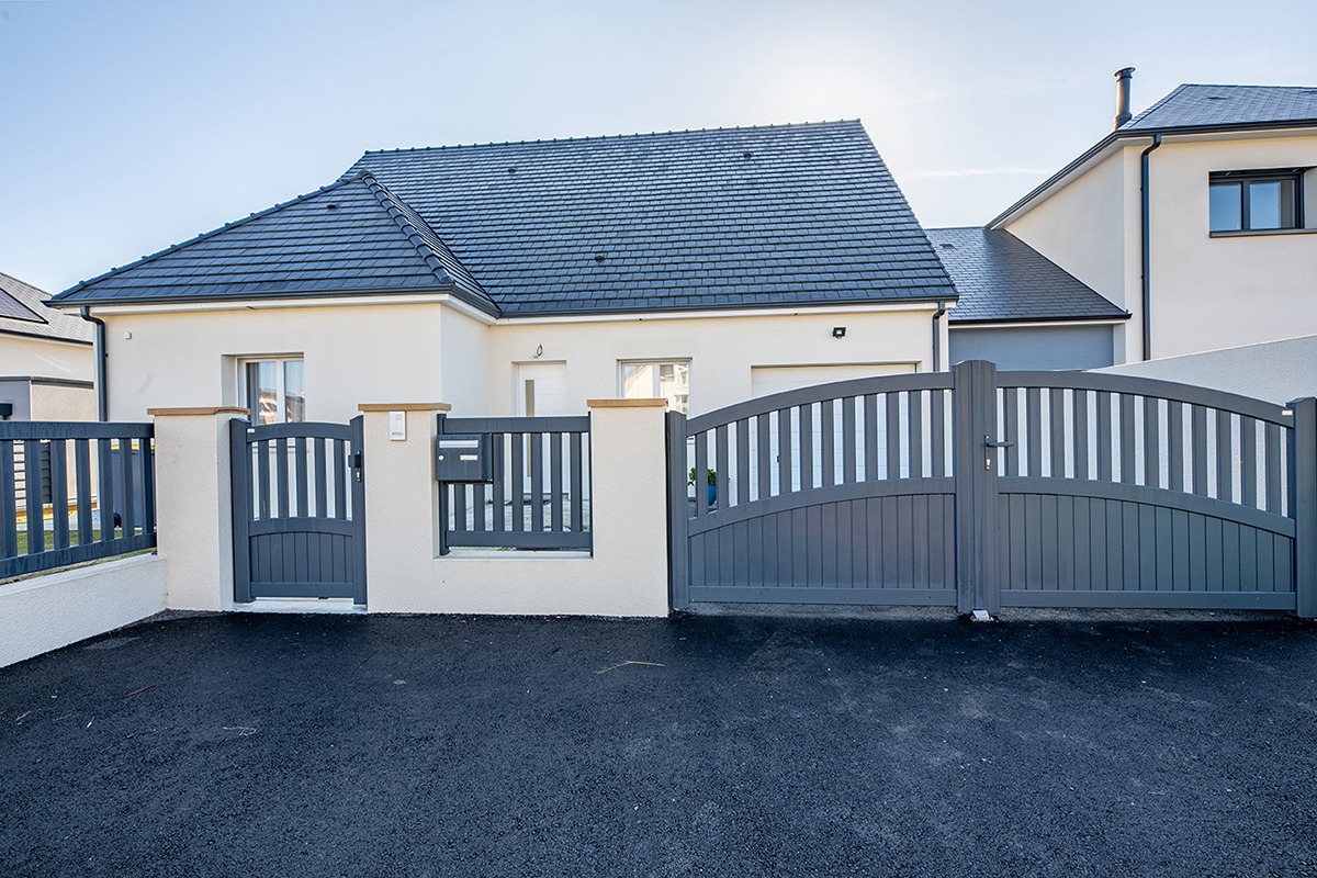 Avec son arc anse de panier, le portail battant Daudet apporte une courbe douce et intemporelle qui s’accorde aux toitures arrondies, aux ouvertures cintrées ou aux façades traditionnelles. Le semi-ajouré équilibre luminosité et intimité : ajouré vertical en partie haute pour laisser passer l’air/lumière et plein vertical en partie basse pour protéger l’espace de vie.