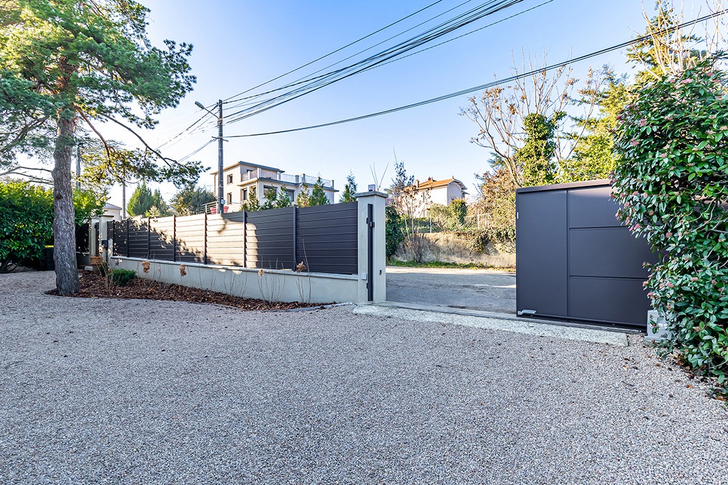 Le portail coulissant aluminium Quadra C8 apporte une touche originale avec son agencement mixte de caissons : horizontaux au centre et verticaux aux extrémités. Ce jeu de lignes renforce l’identité visuelle du portail tout en conservant l’élégance épurée de la gamme Quadra.