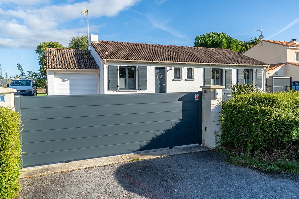 Le portail coulissant Phénix mise sur un plein 100 % alu, doux à manœuvrer et simple à motoriser. Lames larges, guidage sur rail, accessoires complets. 5 couleurs de la gamme Optimo pour matcher la façade. Pour les grandes ouvertures, c’est la solution au look net et à l’intimité totale.
