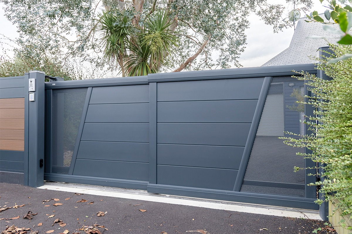 Portail télescopique Corsiva est un modèle plein de la gamme SIGNATURE qui garantit une excellente occultation. Disponible avec des lames horizontales de 170 mm, 255 mm ou en version brise-vent, il allie design moderne, robustesse et confort d’utilisation. Fabriqué en aluminium thermolaqué, il est motorisable et personnalisable. Il offre un accès sécurisé et fluide, parfaitement adapté aux environnements résidentiels contemporains.