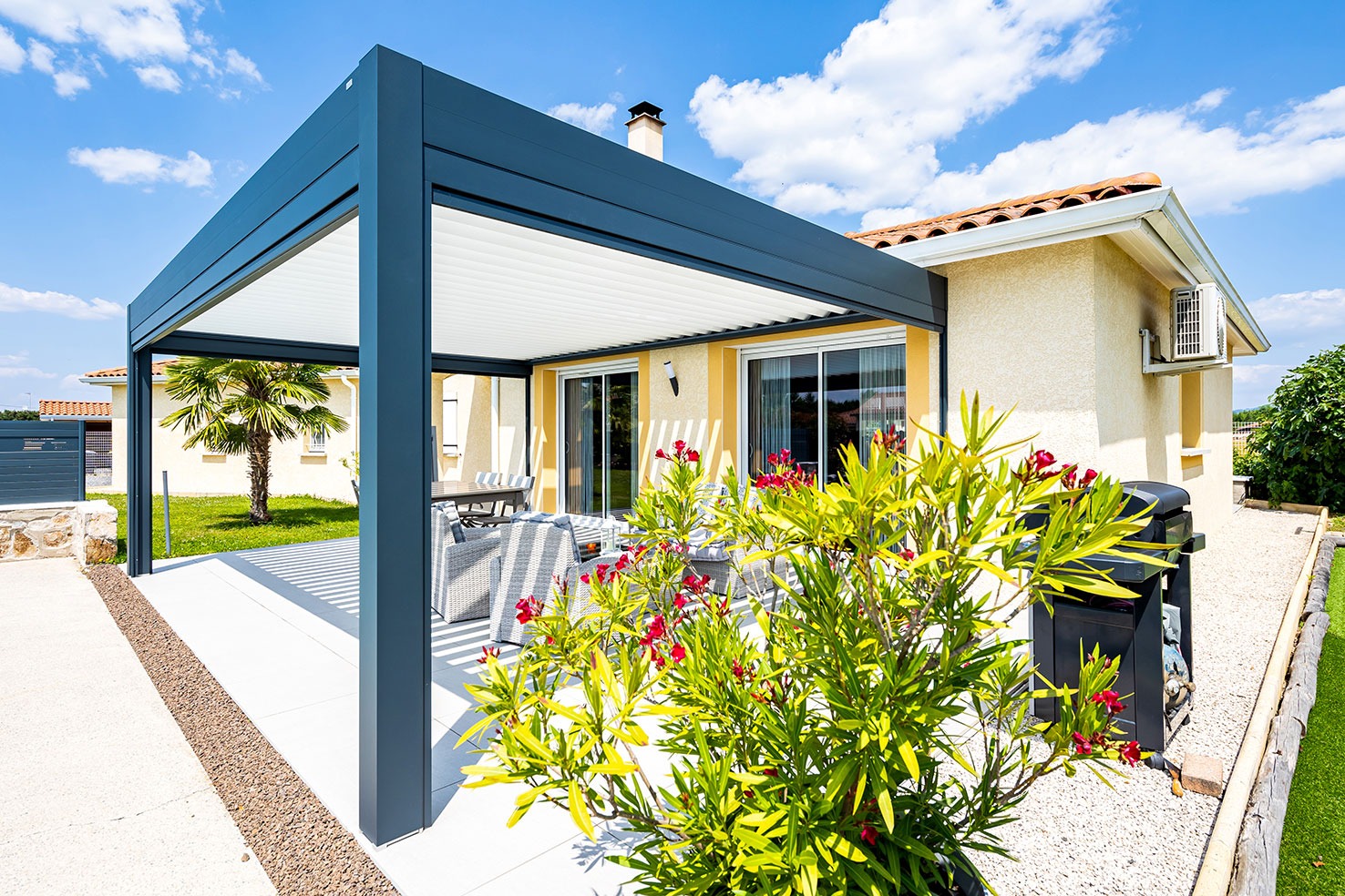 Une pergola bioclimatique offre le mariage parfait entre esthétisme et fonctionnalité pour accompagner votre piscine. Elle crée une zone ombragée et confortable tout en permettant un contrôle précis de l’ensoleillement.