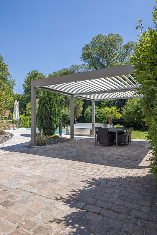 La pergola, d’une teinte grise avec des lames orientables blanches, s’associe assurément bien avec la terrasse en pavés gris clair et marrons. Le gris des pavés font magnifiquement bien avec la structure de la pergola et les lames blanches ajoutent une touche de fraîcheur lumineuse.